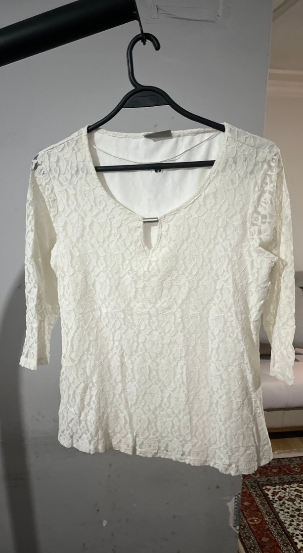 Beyaz renkte, dantel işlemeli ve anahtarlık detaylı V yaka kadın bluz. Uzun kollu, rahat kesim ve hafif keten kumaştan, bohem tarz için uygun.