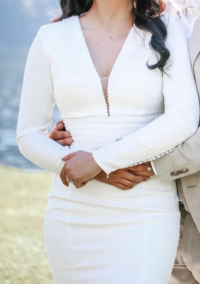 Dantel işlemeli beyaz, V yaka ve uzun kollu, vücuda oturan midi boy nişan elbisesi. Modern klasik tarzıyla şık bir seçim. Pazarlık payı vardır bir kez giyildi kusuru yok K
