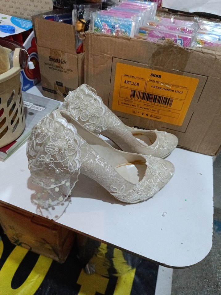 Dantel ve işlemeli detaylara sahip beyaz topuklu gece ayakkabısı, vintage tarzı ve kauçuk tabanı ile düğünler için uygun.