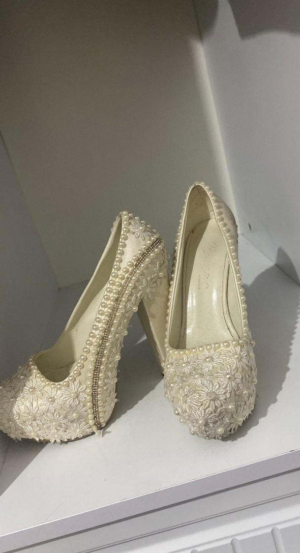 Dantel İşlemeli Beyaz Yüksek Topuklu Gelin Ayakkabısı