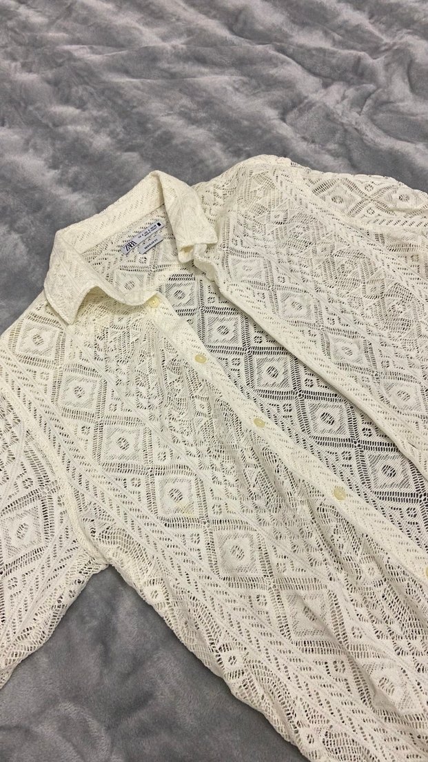 Beyaz örme bluzu, dantel ve işlemeli desenlere sahip. Yakalı, uzun kollu, bol kesim ve günlük kullanıma uygun.