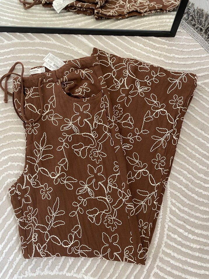 Uzun, bol kesim kahverengi kumaş pantolon, dantel işlemeli detaylara sahip, bohem sokak stili için uygun. Günlük kullanım için rahat. Hiçbir hasarı yok 1 ay önce alındı tertemiz iki kere kullandım terzilik işlemi yok
