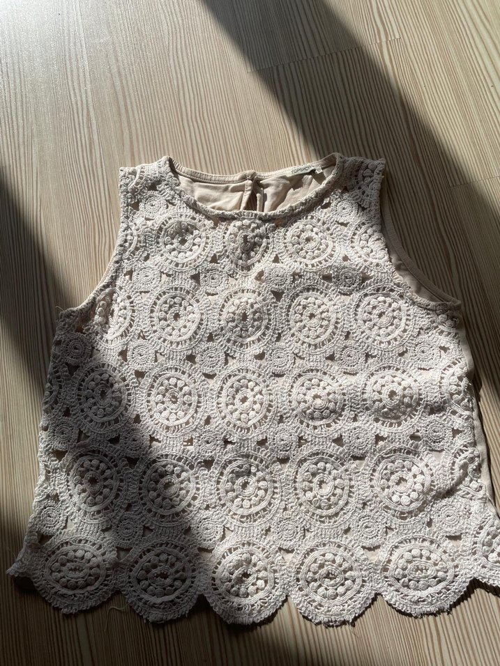 Dantel işlemeli, kolsuz, bohem tarzda bej kadın bluz. Yuvarlak yaka ve bol kesim özelliklerine sahip, günlük kullanıma uygundur.