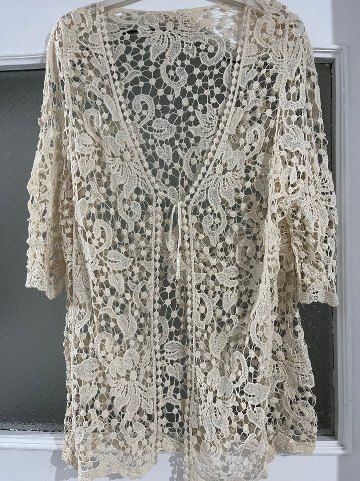V yaka ve uzun kollu, dantel işlemeli bohem tarzda, bol kesim midi uzunlukta hırka. Dış mekan kullanımı için uygun, örme kumaştan.