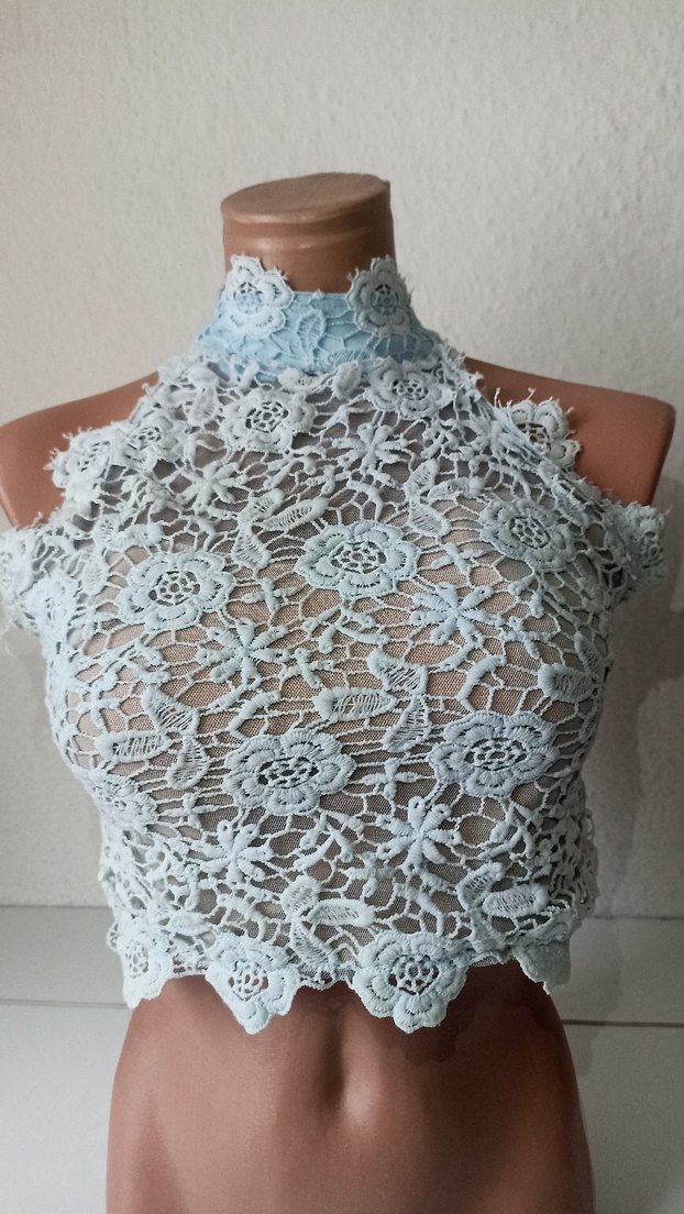 Dantel işlemeli, yüksek yakalı, kolsuz ve vücuda oturan kısa boy mini bluz. Pastel mavi tonlarda, bohem parti tarzına uygun.