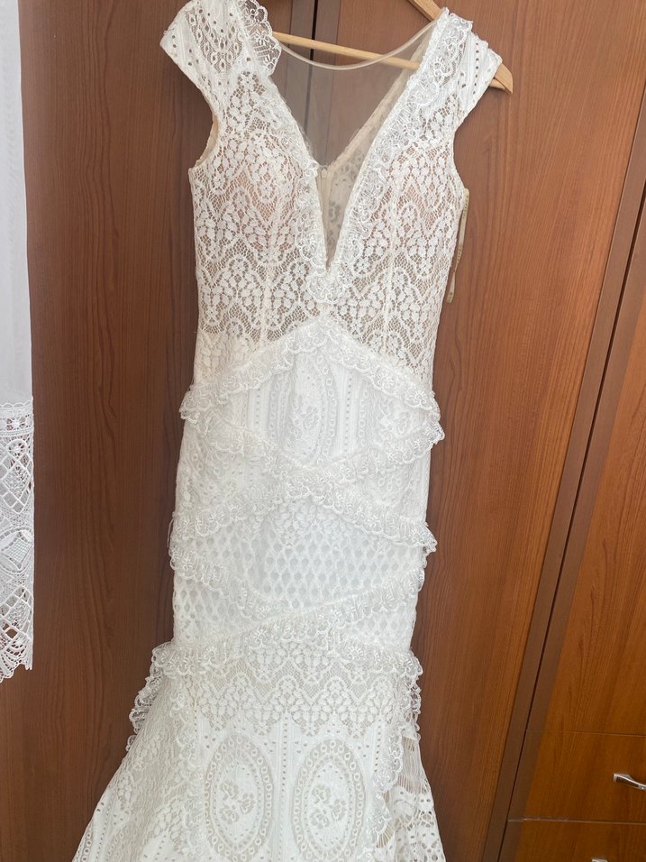 İnce işlemeli dantel detayları ve V yakasıyla, bohem tarzda, uzun ve kolsuz, beyaz renkli dar kesim nişan elbisesi.