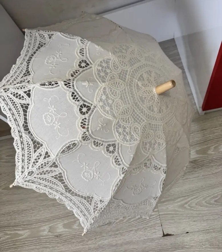 ***Hediyeliii*** Bohem tarzda, ince dantel işlemeli ve ahşap saplı şemsiye, zarif bir görünüm sunar. ☂️ kullanılmamış gelin saç aksesuarı ile gönderilecektir #düğün #nikah fotoğraf çekimi