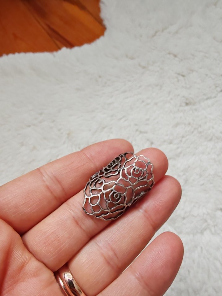 Bu kadın yüzüğü, dantel görünümlü çiçek desenlerine sahip bohem vintage tarzındadır. Antik gümüş rengindedir. Ayarlama kısmında hafif kararma olsa da desen kısmı temizdir.