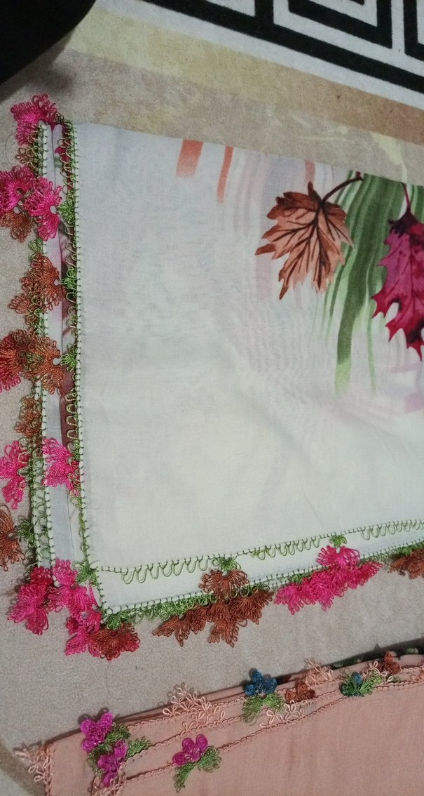 Yaprak desenli, pastel renklerde ve dantel işlemeli kenarlarıyla bohem tarzda yumuşak dokulu kadın yazmalar tane fiyatı