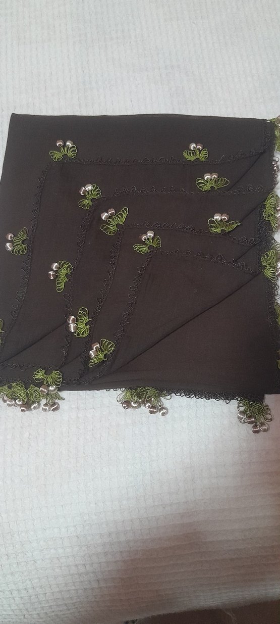Kahverengi fular, dantel işlemeli yeşil kiraz iğne oyası 'reyyan' markalıdır.