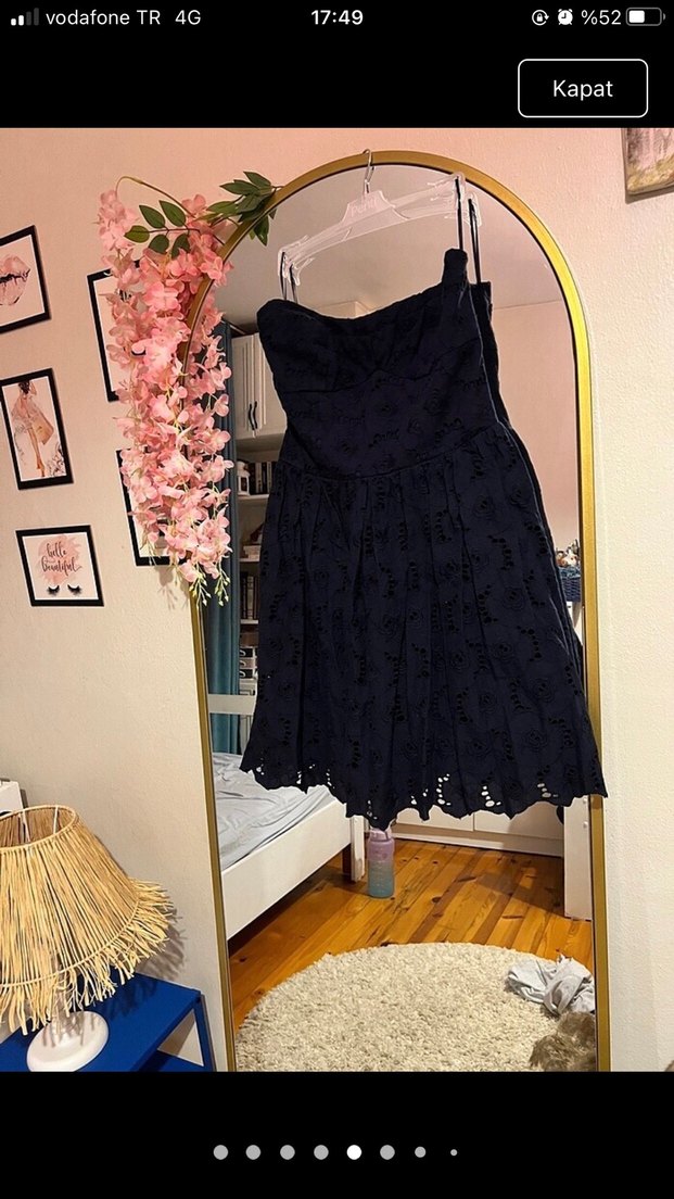 Fitted kesim, straplez yaka ve işlemeli dantel detaylara sahip lacivert gece elbisesi, romantik buluşmalar için uygun.