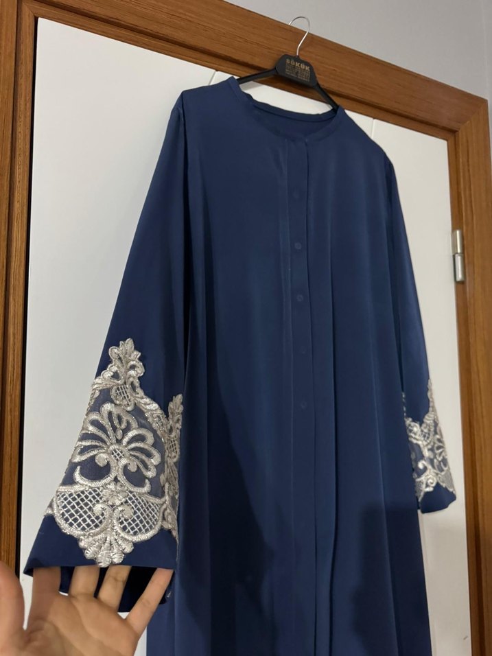 Lacivert, uzun kollu, dantel işlemeli manşetlere sahip bol kesim uzun elbise, sentetik kumaştan üretilmiştir.