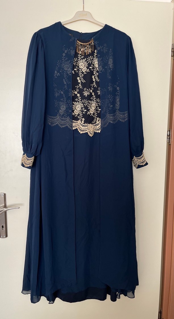 Lacivert, uzun kollu, yüksek yakalı, bol kesim ve işlemeli dantel detaylı uzun elbise. İpek gibi kumaştan, klasik ve vintage tarzda, ofis için uygun. 56 beden