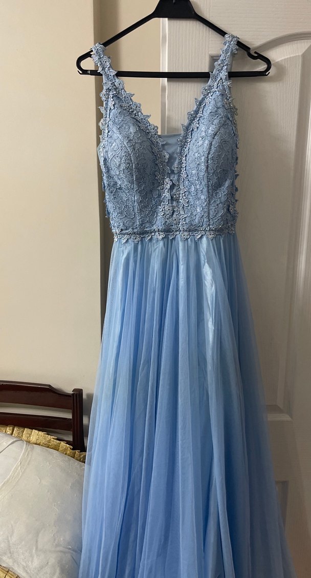 Pastel mavi renkte, işlemeli dantel detaylı, V yakalı ve kolsuz bohem tarzda uzun nişan elbisesi. İnce oturan kesimiyle şık ve zarif.