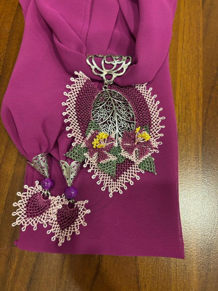 Mor renkli, dantel işlemeli ve metal yaprak süslemeli, bohem tarzda kadın şalı.