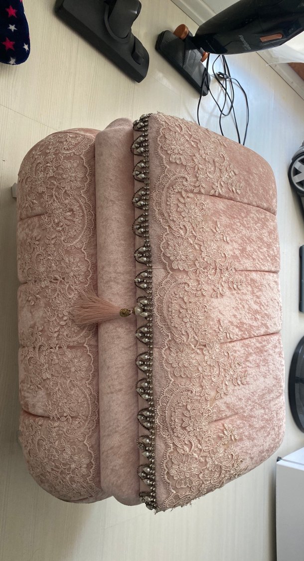 Dantel işlemeli, pastel pembe tekstil malzemeden kadın abiye çanta. Vintage dokunuşlu, klasik ve zarif tarzda, düğünler için uygun.