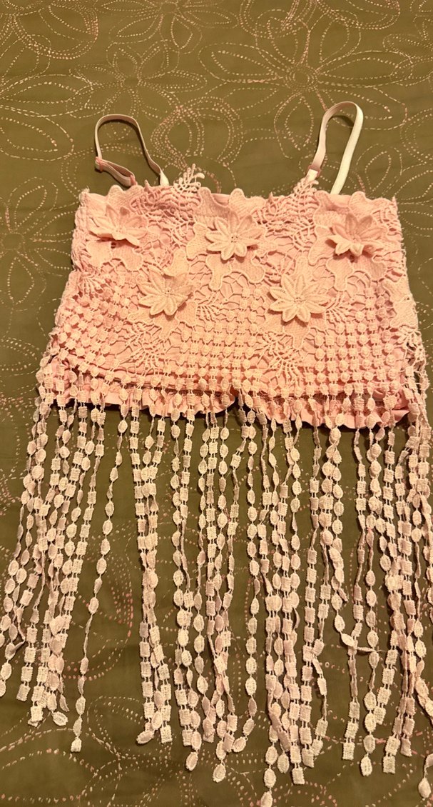 Dantel ve işlemeli çiçek desenli, pastel pembe penye kumaştan yapılmış, askılı ve straplez yakalı, uzun püsküllerle bohem tarzda kız çocuk bluzüdür.