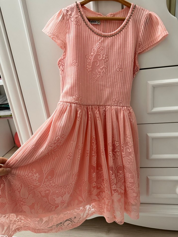 Dantel işlemeli, kısa kollu, V yakalı pembe elbise, bohem klasik şıklık sunar. İki defa kullanıldı astarlı şık ve güEl bir elbise 8 9 yaşa uygun