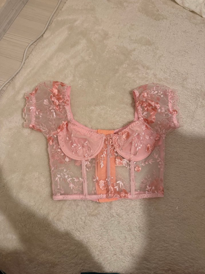 Pembe, işlemeli dantel detaylı, kısa askılı, straplez yakalı, sentetik kumaştan yapılmış bohem tarzda mini bustiyer. Parti için uygun.