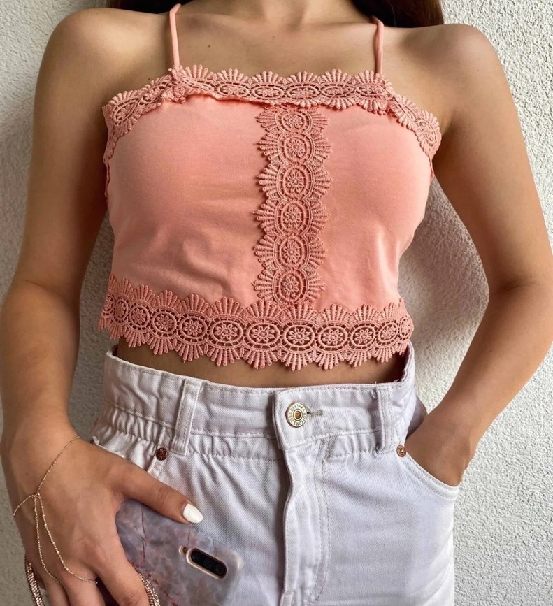 İnce askılı, dantel işlemeli pembe mini büstiyer, günlük kullanıma uygun bohem ve rahat bir stil sunar.S M
