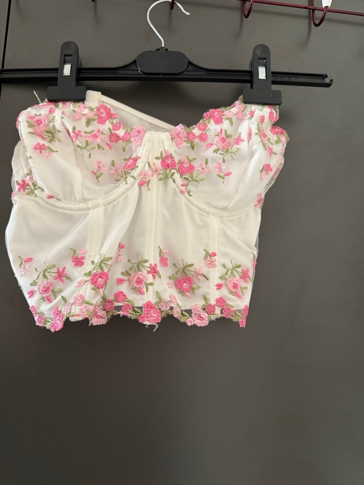 Pembe işlemeli dantel detaylı, straplez kısa büstiyer. İnce askılı ve bohem tarzda, parti için uygun.