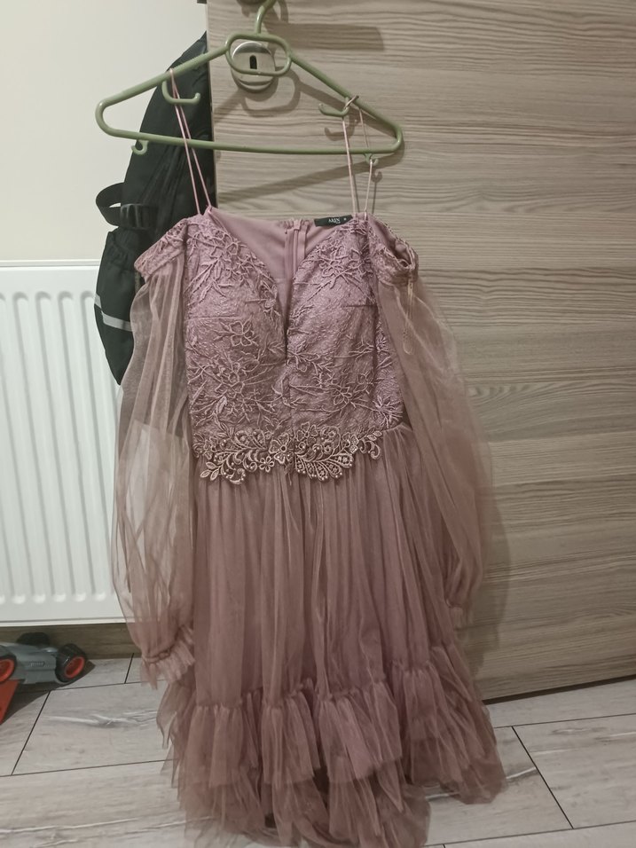 Uzun, pastel pembe renkli, dantel detaylı ve işlemeli desenlere sahip bohem tarzda nişan elbisesi. Askılı ve omuzları açık, bol kesimdir.