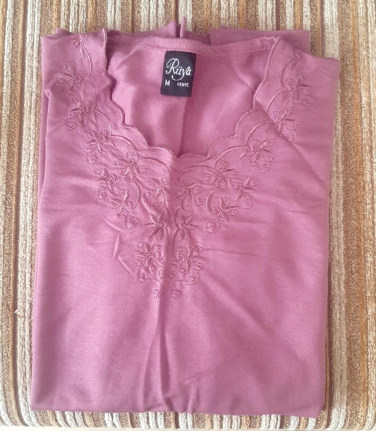 Pembe, V yaka, kolsuz, bol kesim kadın bluz. İpek gibi kumaş, işlemeli dantel detaylı, uzun kesim, bohem tarzda. Beden M.