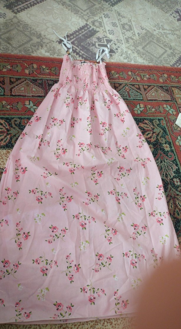 Dantel ve nakışlı çiçek desenlerine sahip uzun pudra pembe elbise. Askısız ve bol kesim, bohem tarz düğünler için uygun.