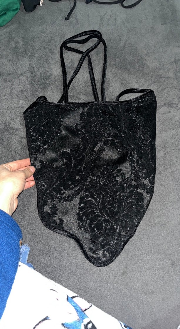 Dantel işlemeli, askılı ve straplez yaka tasarımlı siyah gotik tarzda, vücuda oturan bir büstiyerdir. ✨