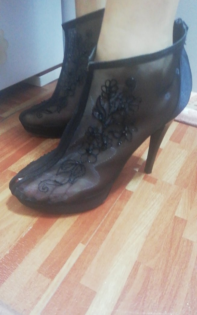 Dantel işlemeli şeffaf malzemeden yapılmış siyah ince topuklu botlar, gotik tarzı ve cesur görünümü romantik akşamlara taşır. Kauçuk taban dayanıklılık sağlar.