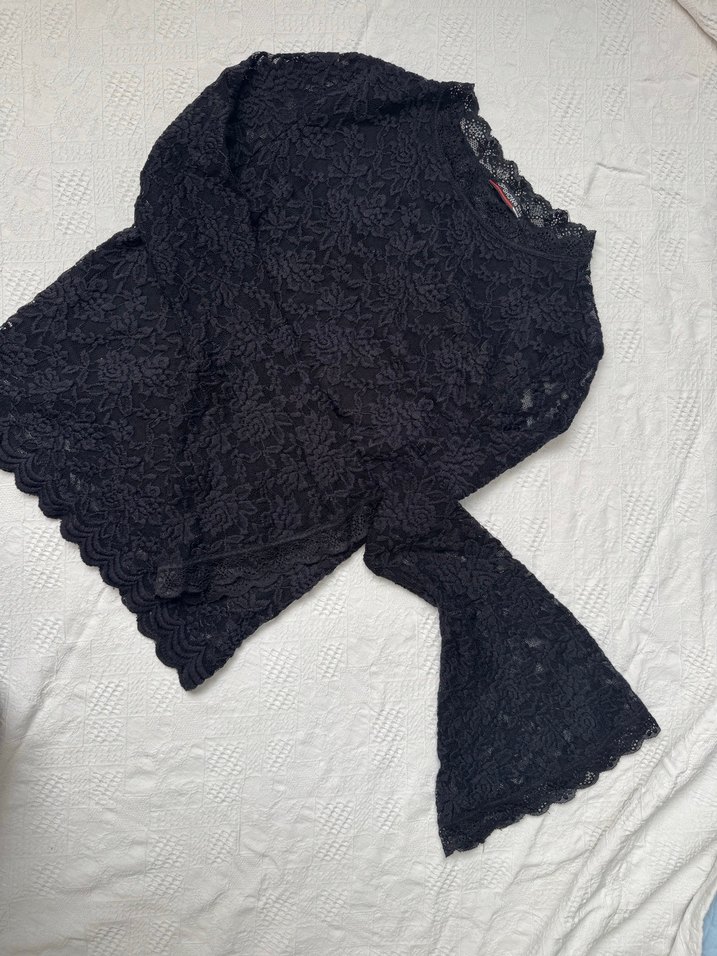 Siyah, işlemeli dantel örgüden, uzun kollu ve tekne yaka, fitted kesim kadın bluz, gotik tarzda. ✨arkası ful dantel