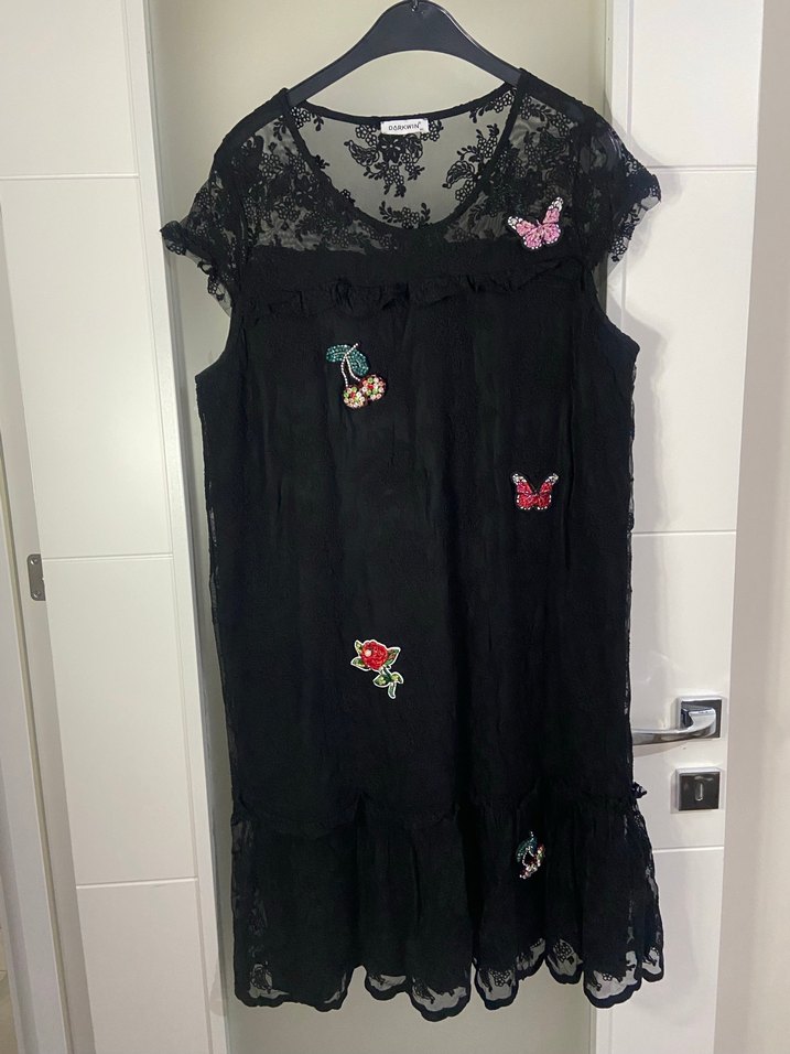 Siyah renkli, dantel detaylı ve işlemeli desenlere sahip, salaş kesim ve kolsuz uzun gece elbisesi. Romantik akşamlar için uygun. Bir kez kullanıldı