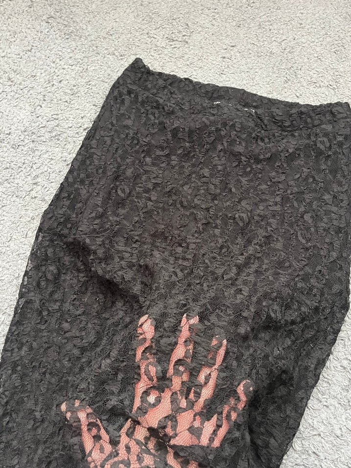 Dantel ve işlemeli detaylara sahip siyah, vücuda oturan midi etek, gotik tarzda ve dış mekan kullanımı için uygundur.
