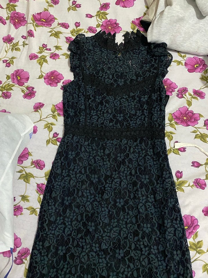 Dantel işlemeli, kolsuz, V yakalı, siyah midi elbise, klasik ve gotik şıklığı bir araya getiriyor.