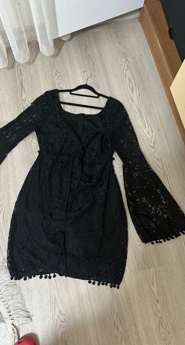 Siyah, dantel işlemeli uzun kollu, V yakalı, vücuda oturan midi elbise, romantik akşamlar için uygun.