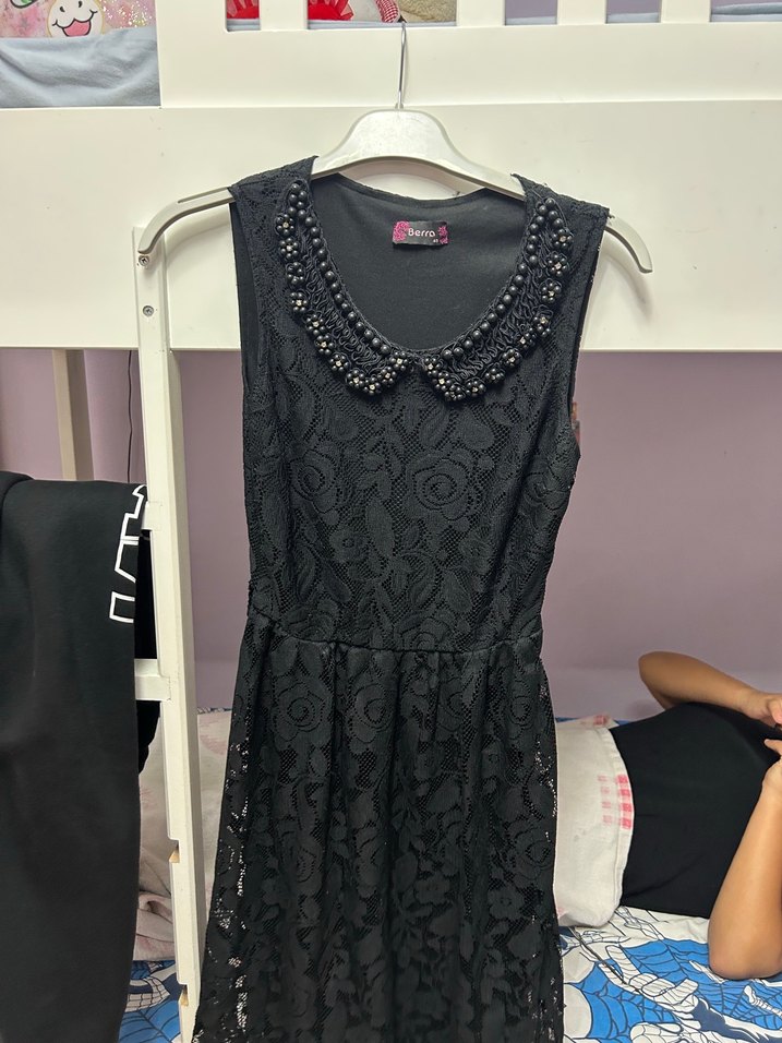 Dantel işlemeli, kolsuz ve yakası boncuk detaylı siyah midi elbise. Hiçbir sorunu yok