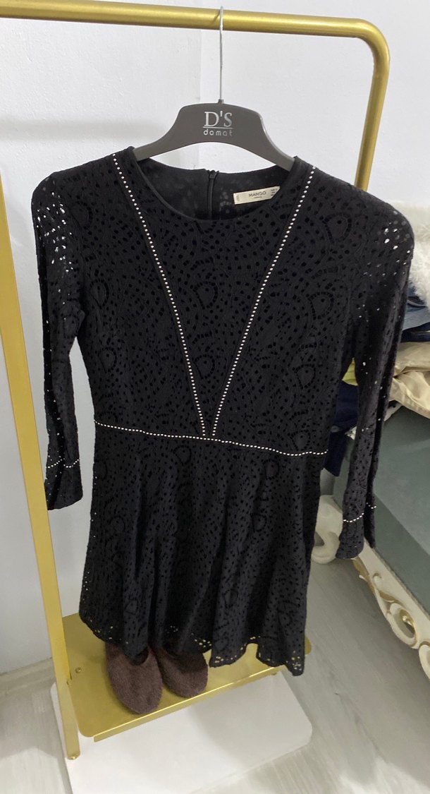 Dar kesim siyah midi elbise, uzun kollu ve dantel işlemeli detaylara sahip, V yaka ve Paris tarzı gotik şıklık sunar. ✨