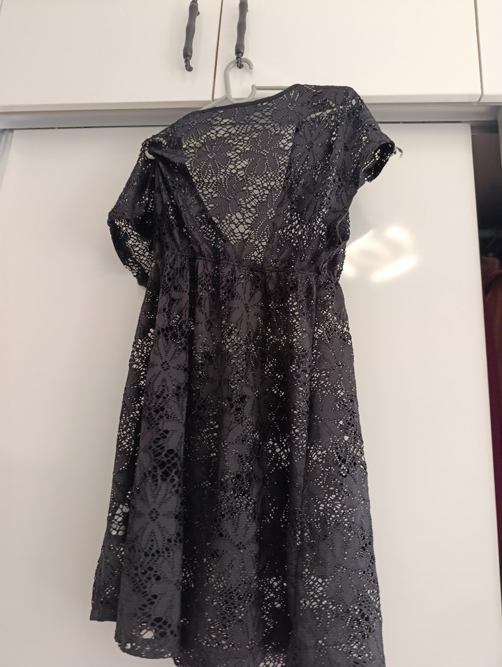 Siyah midi boy işlemeli dantel detaylara ve V yakaya sahiptir. Kısa kollu, bol kesim ve plaj tarzında,