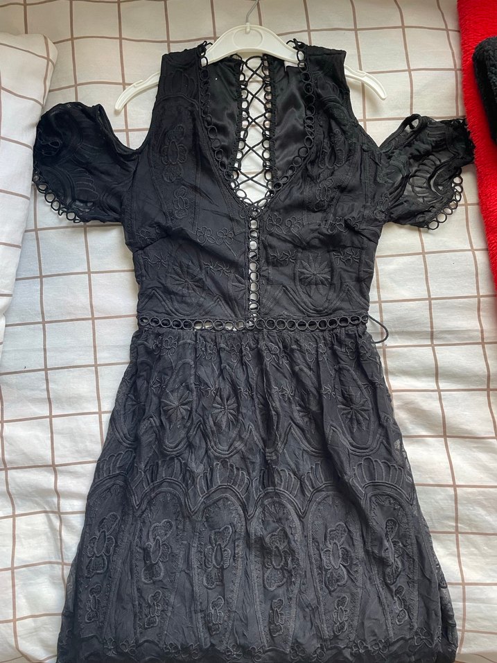 Dantel işlemeli siyah midi elbise, v-yaka ve askılı kollarıyla romantik akşamlar için uygun, vücuda oturan kesim. Butikten aldım 38-40 bedene uygun