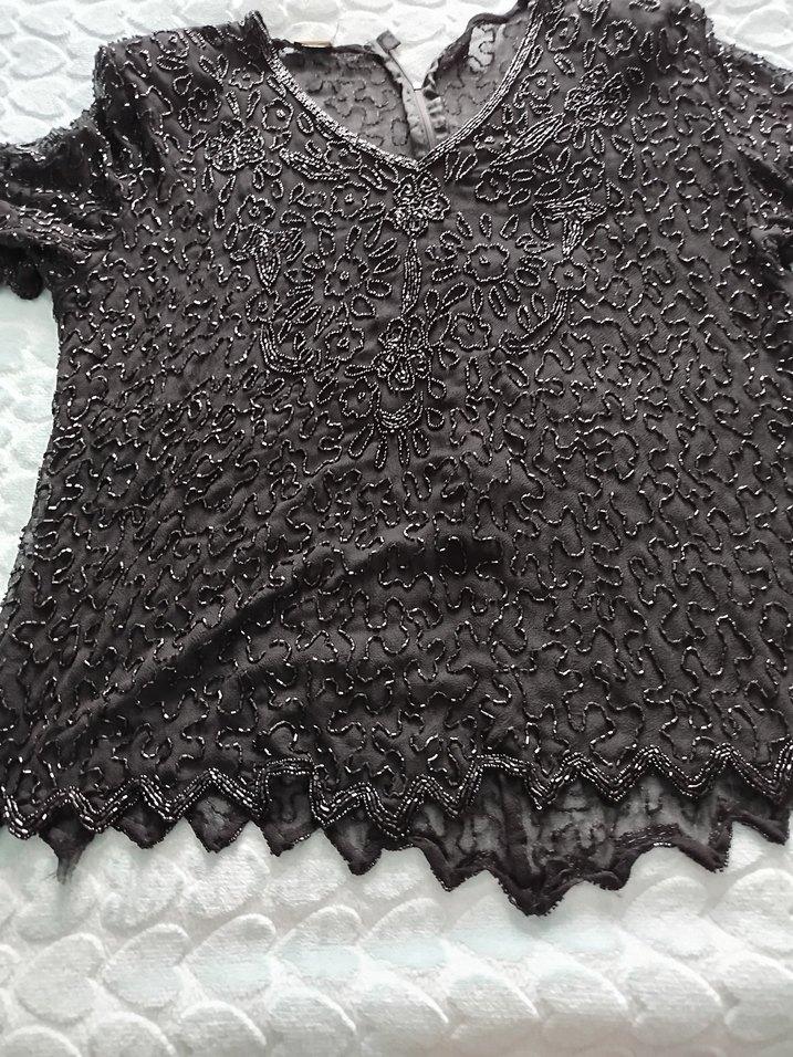 Dantel işlemeli siyah mini bluz, kısa kollu ve V yakalıdır. Örgü kumaştan yapılmış, bol kesim ve işlemeli detaylara sahiptir. Gotik ve bohem tarzlara uygundur.