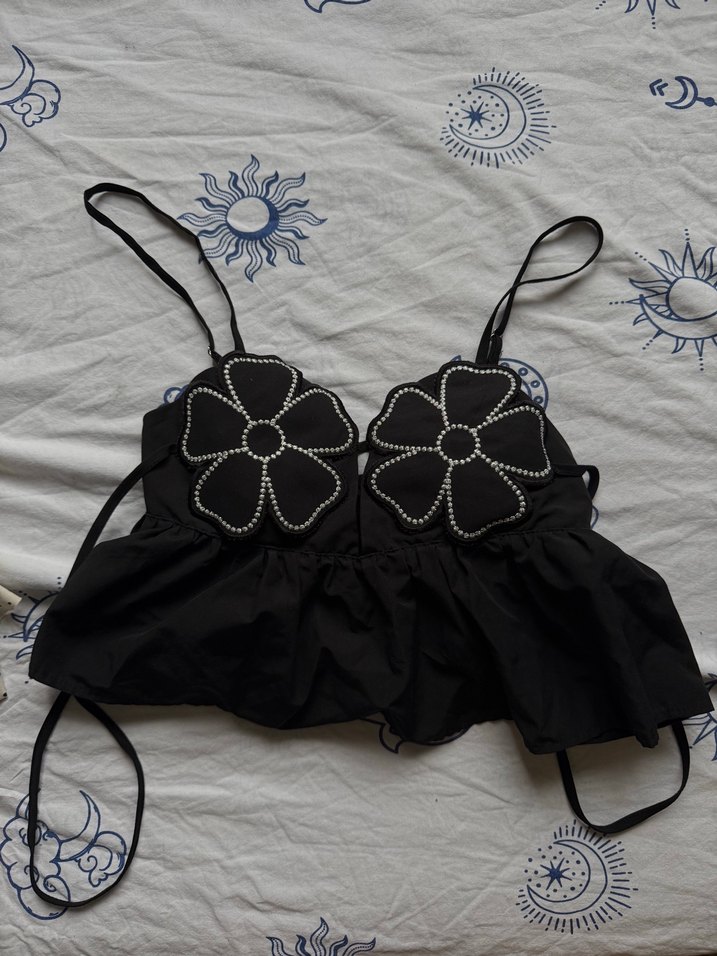 İnce askılı, işlemeli çiçek detaylı siyah straplez bustiyer, kısa ve sirt detayli baglamali gogusu buyuk olan birinin rahat edemeyecegi bir ust