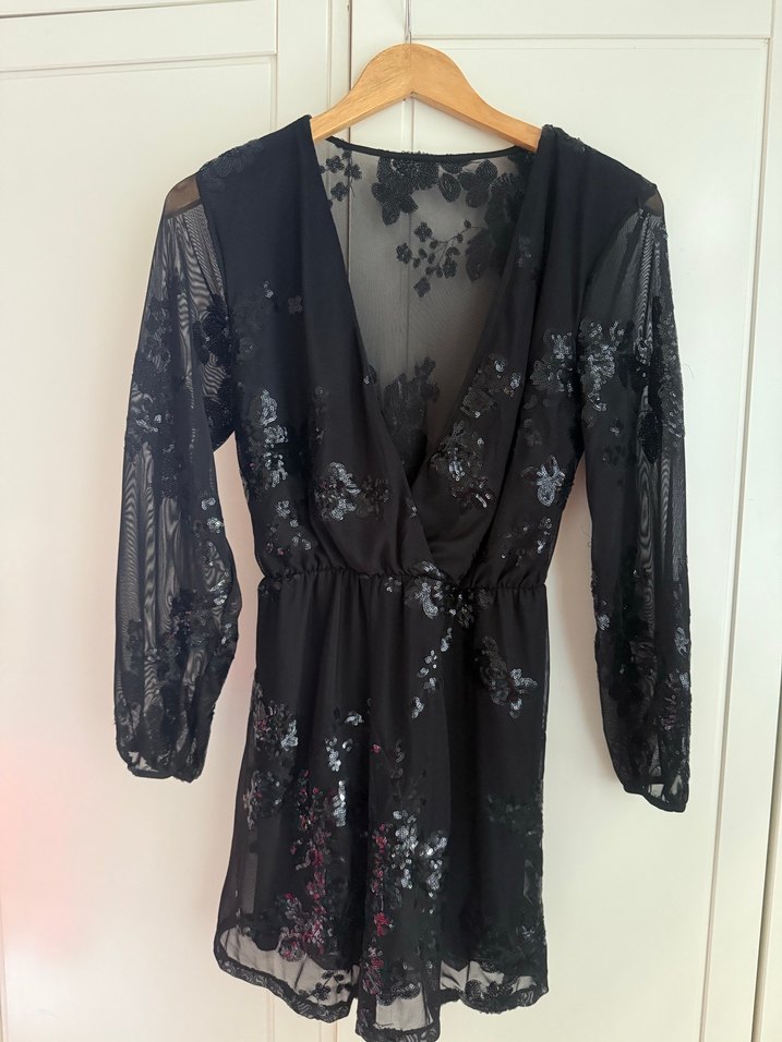 Dantel işlemeli, uzun kollu, V yaka, siyah tulum Gotik tarzda, vücuda oturan kesimiyle romantik akşamlar için uygun. Beli lastikli.