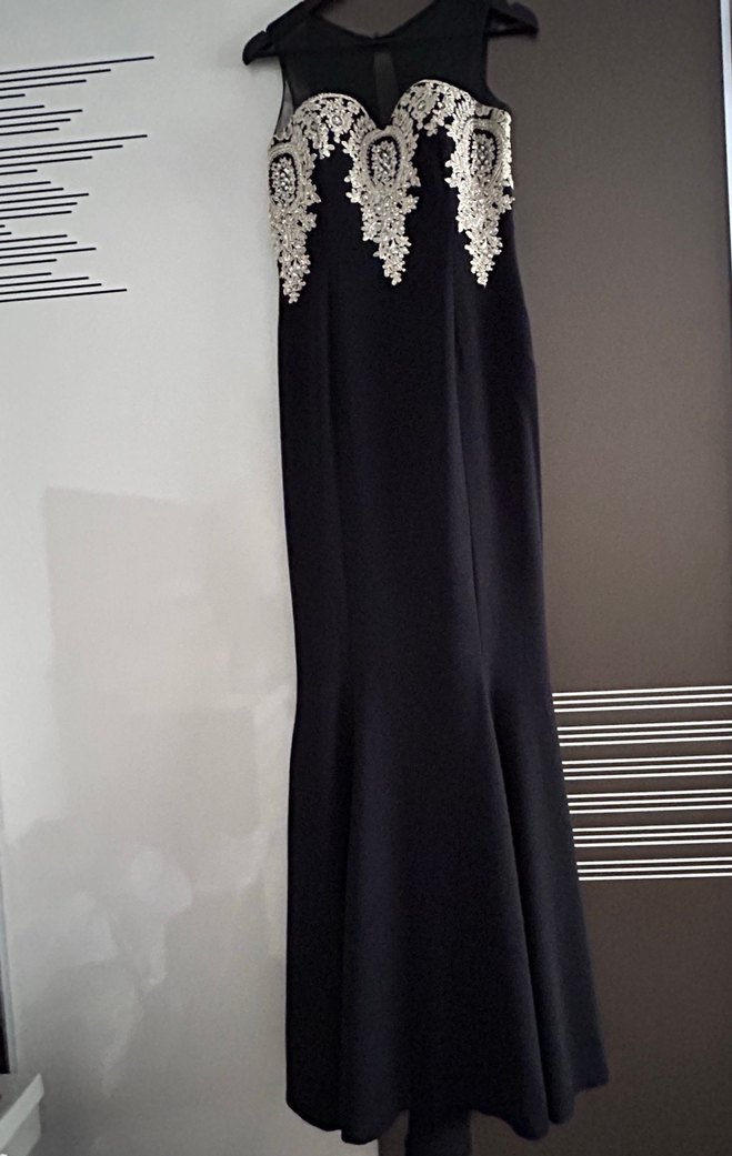 Siyah uzun abiye elbise, straplez ve kolsuzdur. Dantel işlemeli detaylarla süslenmiş, şık ve klasik modern tarzda, düğün gibi özel anlar için uygundur. ✨