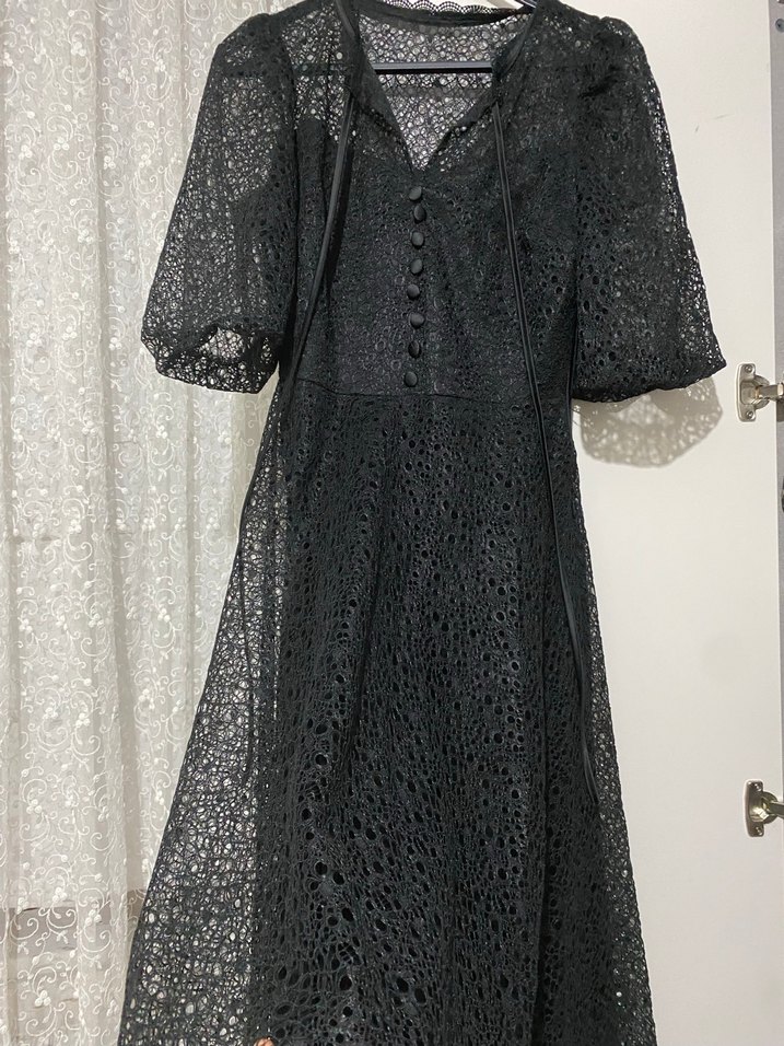 Dantel işlemeli, V yakalı ve askılı kollu siyah uzun elbise. Sentetik kumaştan, bol kesim ve gotik tarzda.