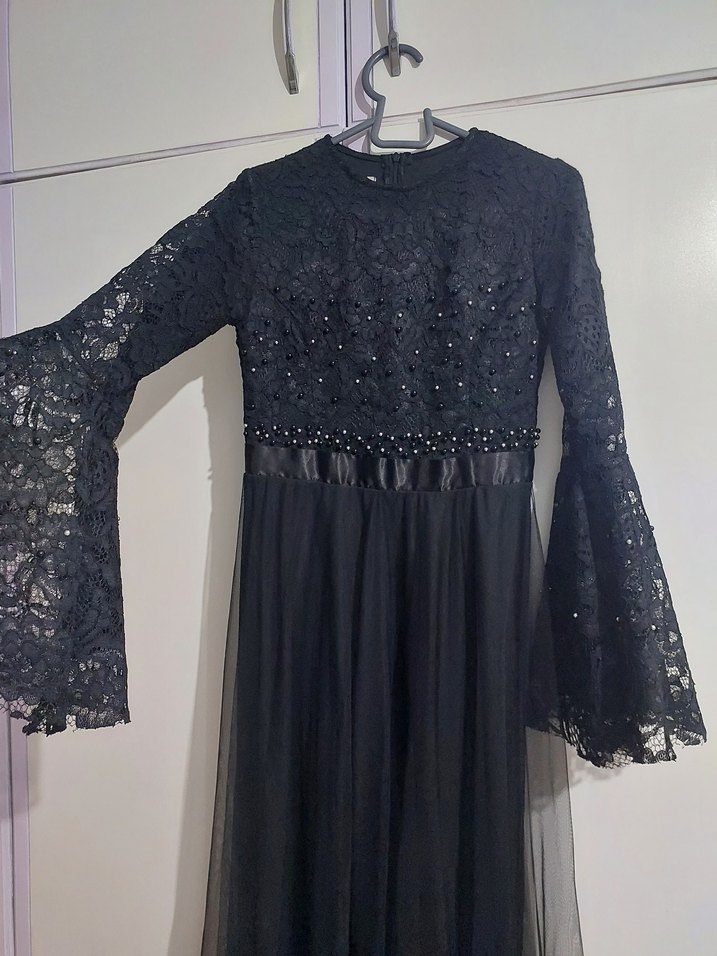 Siyah, dantel işlemeli ve boncuk detaylı, vücuda oturan uzun abiye elbise. Yuvarlak yaka ve ince askılı kollara sahip, düğünler için gotik tarzda klasik şıklık sunar.