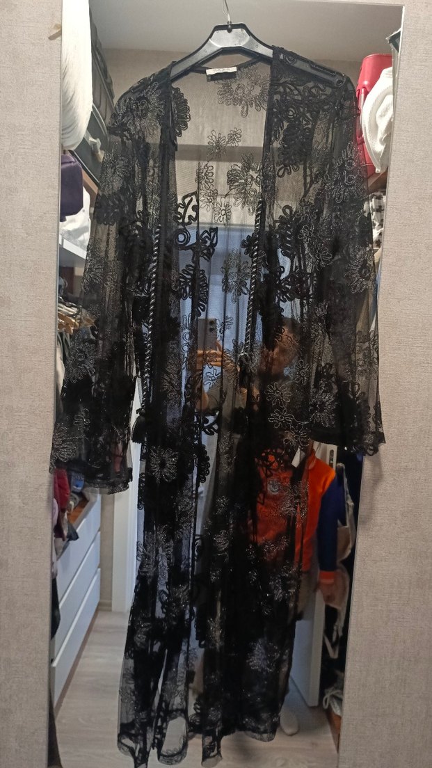 Dantel işlemeli, uzun siyah kimono, bol kesim ve uzun kolludur. Straplez yakaya sahip olup, günlük kullanıma uygundur.