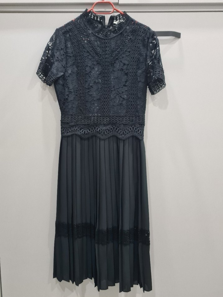 Yüksek yakalı ve kısa kollu, dantel işlemeli siyah gotik elbise. Pilili uzun etek kısmı klasik zarafet sunar, ofis kullanımı için uygundur.