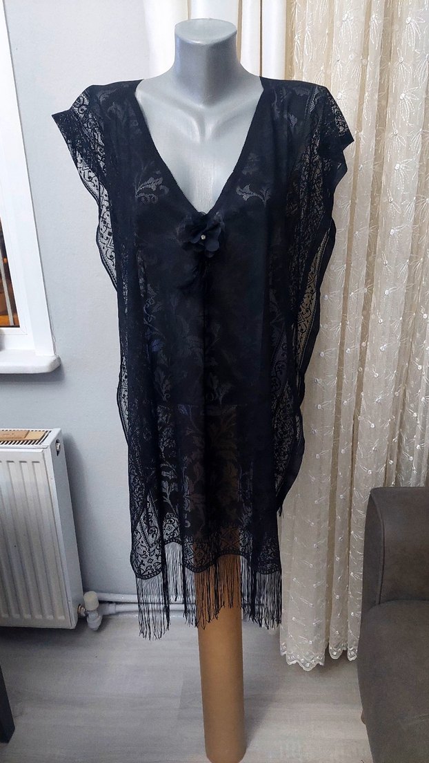 Az kullanılmış temiz S/M bedene uygun pareo.... Bu siyah pareo, dantel detayları ve işlemeli desenlerle süslenmiştir. Salaş kesimi, kolsuz tasarımı ve püsküllü ucu ile gotik ve bohem tarzını yansıtır.