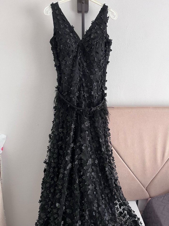 V yaka, askılı, dantel ve işlemeli detaylara sahip siyah uzun gece elbisesi. Gotik tarzda düğünler için uygundur.
