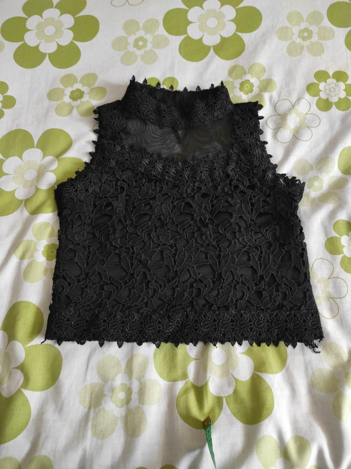 İşlemeli dantel kumaştan yapılmış, yüksek yakalı ve kolsuz, siyah renkli, vücuda oturan bluz. Gotik tarzda ve parti için uygun midi uzunlukta.